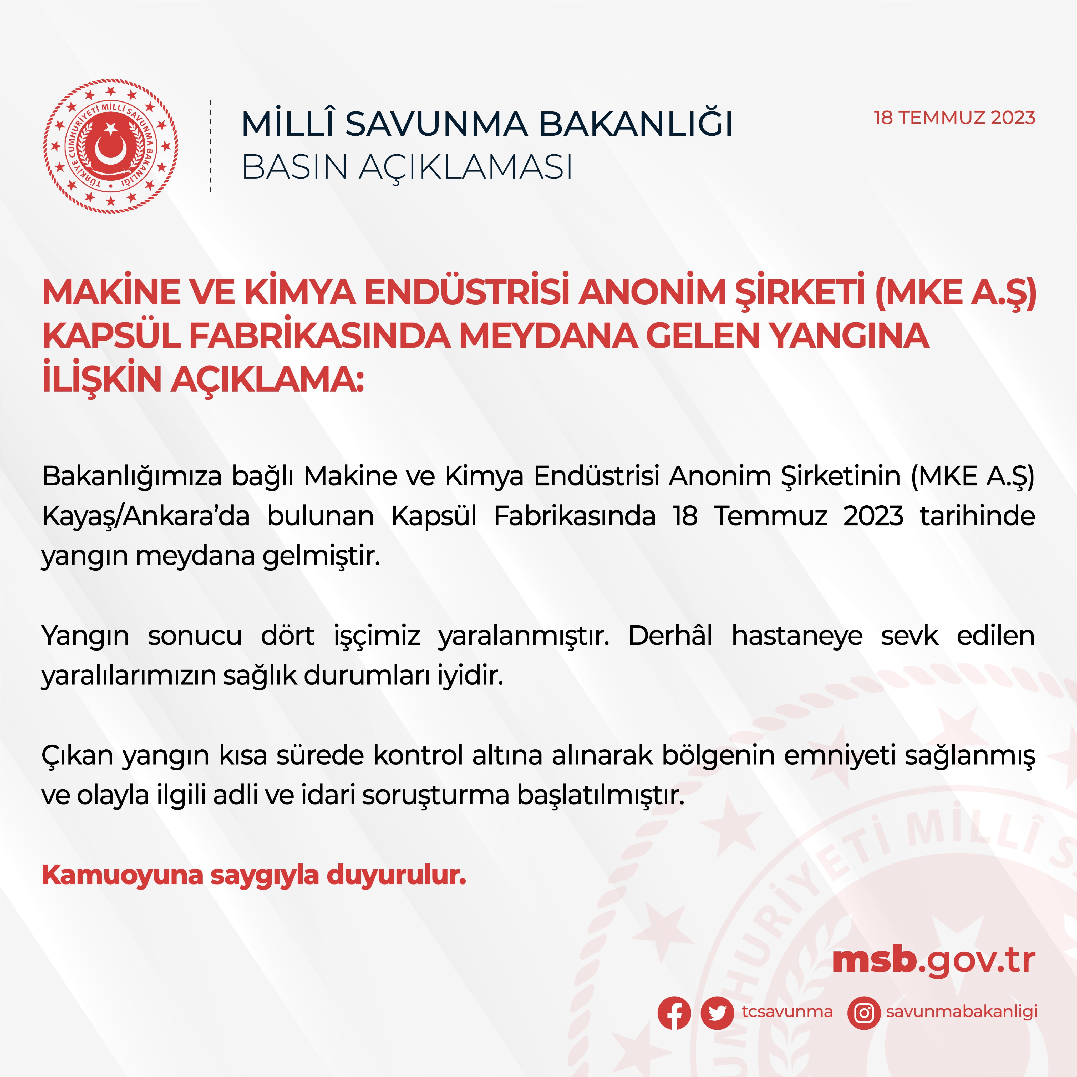 MKE Basın açıklaması yaparak yangın hakkında bilgi verdi. Açıklamada, yangının fabrikanın kapsül üretim bölümünde başladığı, yangına itfaiye ve askeri helikopterlerin müdahale ettiği, yangının sabah saatlerine kadar sürdüğü ve kontrol altına alındığı bildirildi. Açıklamada, yangında maddi hasar meydana geldiği, ancak can kaybı yaşanmadığı bildirildi.